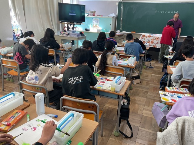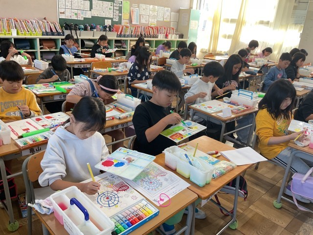 4年生は図工でコリントゲーム作りに取り組んでいます。まずは、盤になる部分の絵を描いていきます。絵が終われば、角木を切ってつけたり釘を打ったりして、ゲームを完成させていきます。