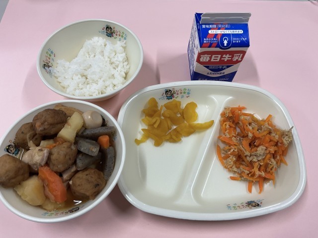 「かんとうに」は、じゃがいもやこんにゃく、あつあげなど、豊富な種類の食材が使用されています。食材にしっかり味が染みており、美味しくいただきました。「にんじんシリシリ」は、沖縄県の郷土料理で、「シリシリ」という言葉は「千切り」という意味の方言です。にんじんが苦手な児童は多いですが、ツナフレーが和えられており、一層食べやすく工夫されています。