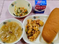 <今日のメニュー>味噌汁・小松菜のごま炒め・たこ揚げ(ソース)・ご飯・牛乳