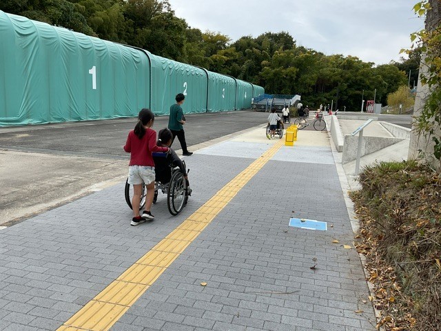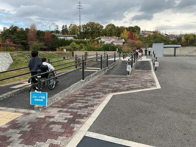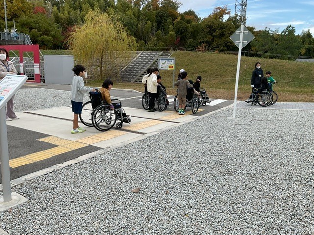 次は車椅子体験です。段差や踏切、勾配など、道路環境が異なる中で体験しました。介助の仕方も相手目線で対応できています。