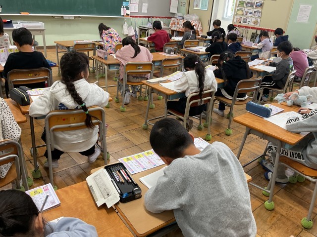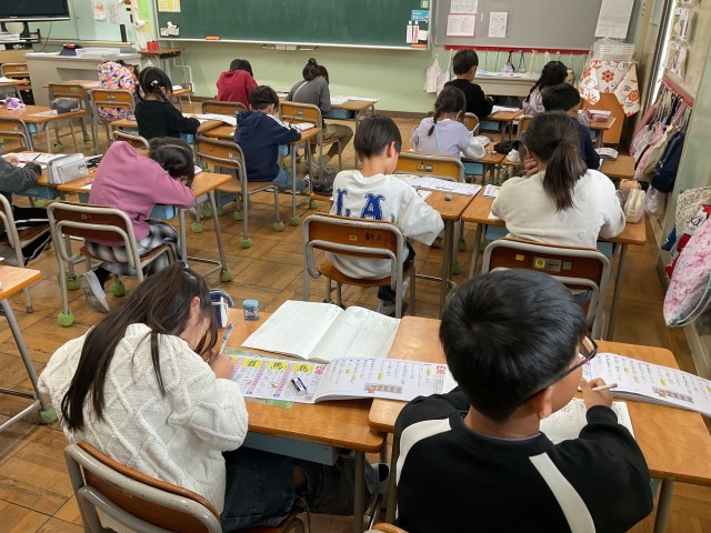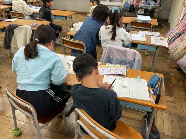2年生の教室では、どちらのクラスも漢字の練習をしています。「番」や「馬」など、画数の多い漢字も増えてきましたが、正しい形で間違いなく書けていますね。