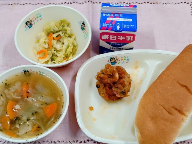 <今日のメニュー>ポトフ・キャベツのソテー・チキンハンバーグ・コッペパン・牛乳