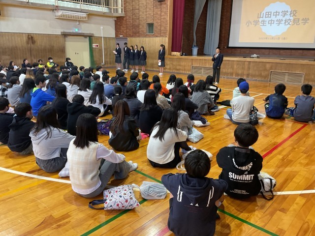 今日の午後は6年生が山田中学校に中学校見学会に行きました。中学校の生徒会役員の人たちから、学校生活の説明を受けたり、クラブの部長カラクラブの説明を受けたりした後は、実際にクラブ活動の見学に。あと4ヶ月で中学生になる6年生たちは、少し中学生になる実感が湧いてきたでしょうか。