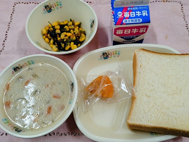 今日は季節の果物、柿がついています。小学校の給食では、調理場で果物の皮を剥いたり切ったりすることができません。(衛生上)ですので、年に何回かこのようにすでに加工場で切ってパックされている果物が出ます。今日の柿は甘くて美味しい柿でした。