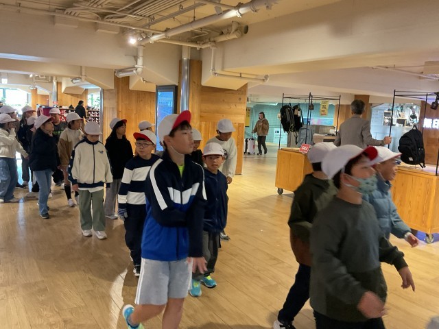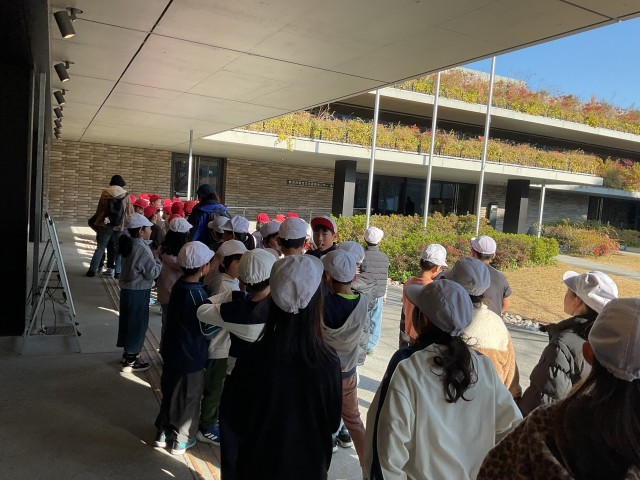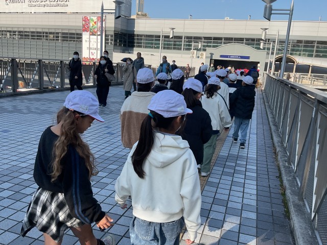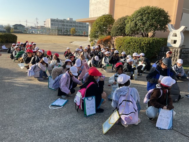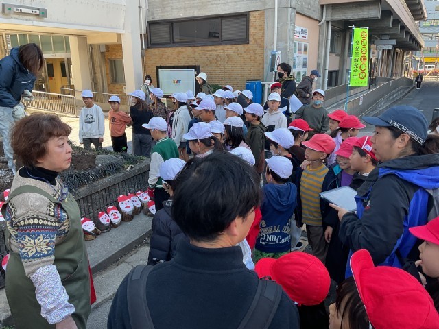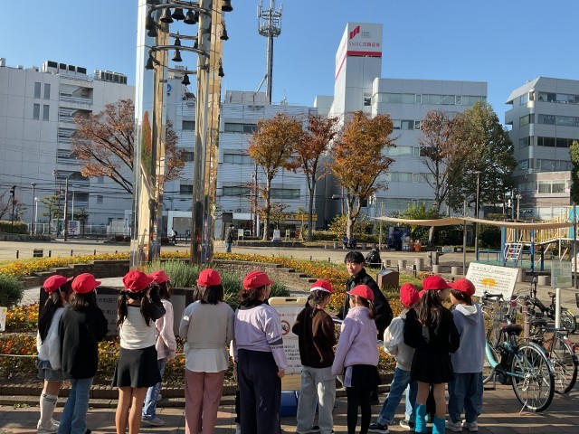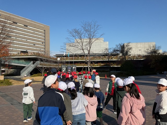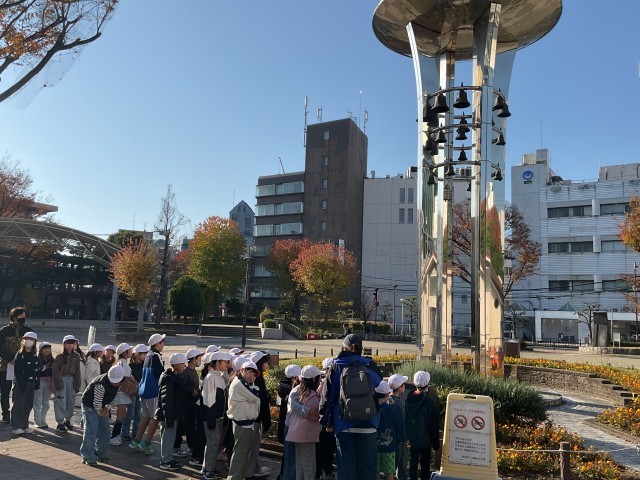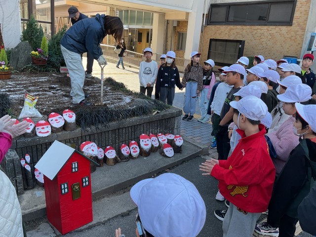 今日は3年生の校外学習で、枚方めぐりをしています。市役所のそばでは花壇の整備をしていた方から声をかけていただき、ぐうぜん交北小のいきいき広場で作った木のサンタを飾る場面を見せていただきました。それから芸術センターに。来年音楽会に来ます。