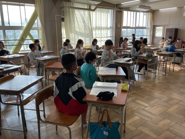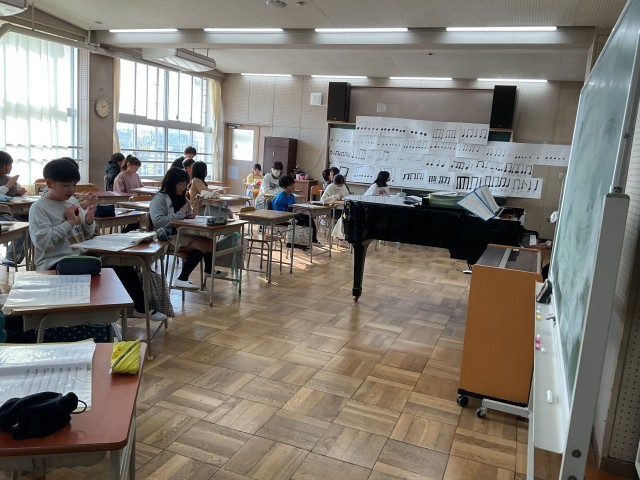 5年生が音楽室で、カスタネットを叩きながらソーランを奏でています。間には、自分たちで作ったリズムに、これも自分たちで作った言葉をのせて歌います。みんなが揃うとなかなかの迫力です。