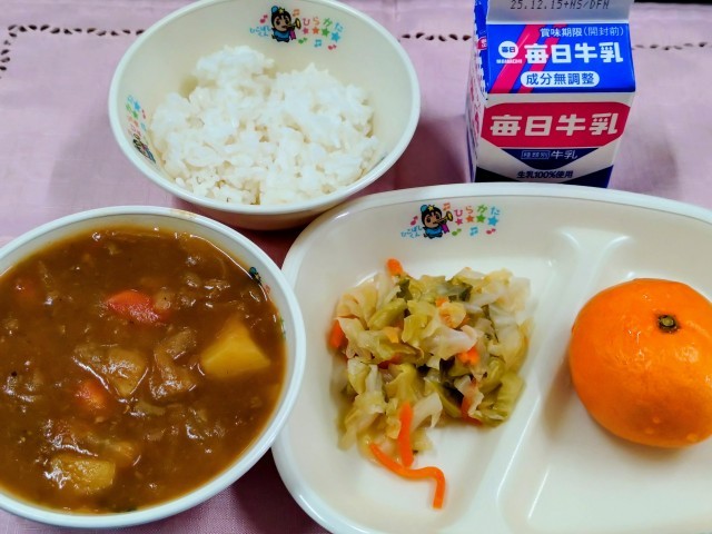 <今日のメニュー>小麦粉なしでもトロトロ冬野菜カレー・キャベツのソテー・みかん・ご飯・牛乳