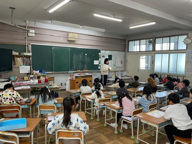めあては「年がじょうをかく」です。子どもたちは送付先の方に対するメッセージを考え、その内容をテキストに書き込みました。その後、実際の年賀状を使用して清書やイラストを書いたりしました。初めて年賀状を書く児童もいましたが、しっかり書き上げていました。