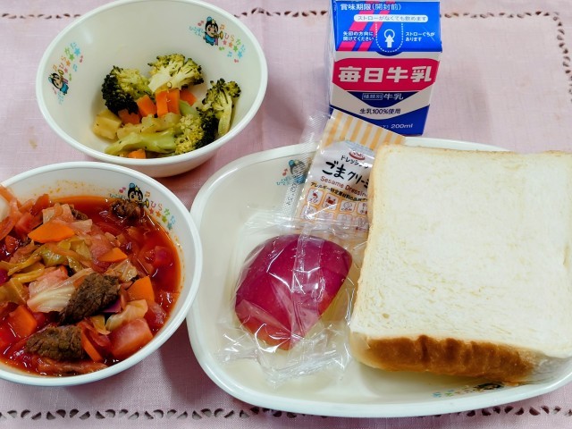 <今日のメニュー>ボルシチ・温野菜サラダ・りんご・食パン・牛乳