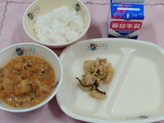 今日の給食の写真をみて『あれ?何か寂しいな』と思われた方もいるでしょう。枚方市の給食は基本的にご飯やパンなどの主食と牛乳の他に、おかずが3品つきます。(デザートなども含む)けれども、今日は紫芋の収穫不足のため、本来予定いていた紫いもチップスが入らず、おかずが2品になってしまいました。今日の代わりに1月にさつまいもチップスがつくそうです。農作物はどうしても気候の影響を受けます。今年は今までも、チンゲンサイや玉ねぎ、人参が不足することがありました。私たちが自然とともに生活をしている一つの証かもしれません。