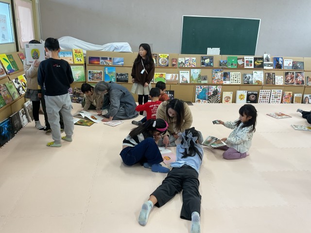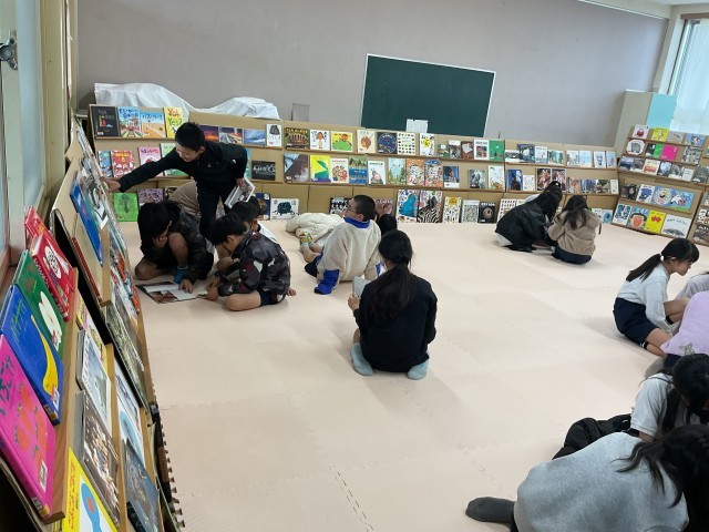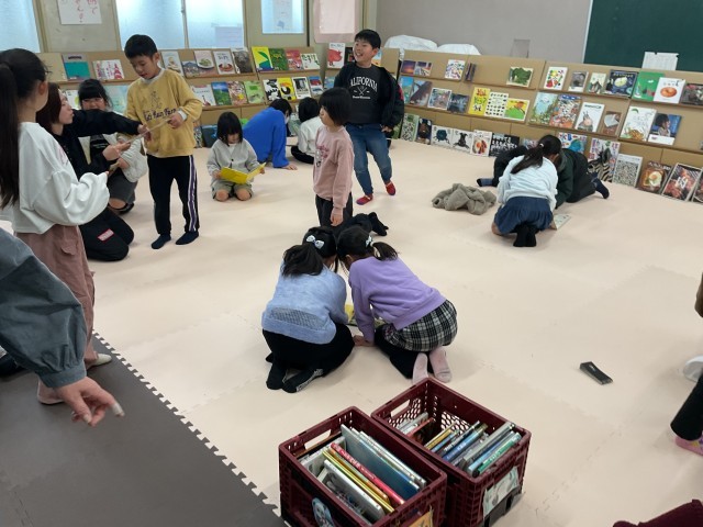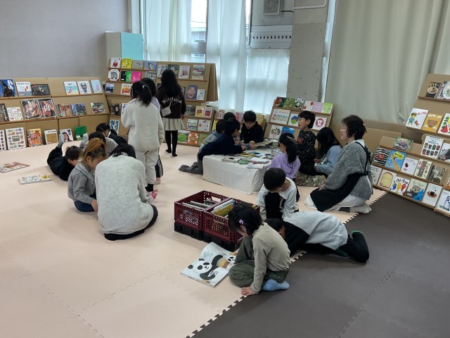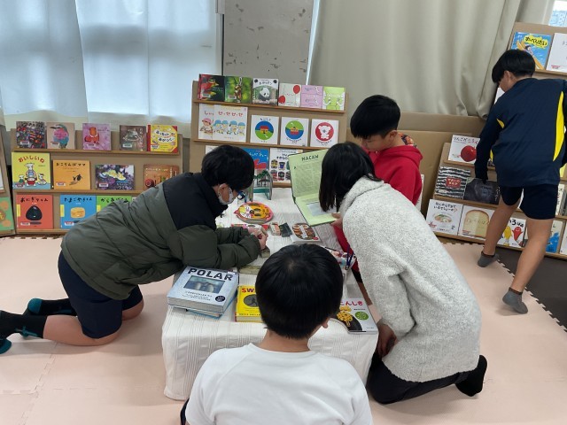 今日から絵の本広場が始まりました。いつも読み聞かせに来ていただいている「お話ドリーム」の皆さんが、準備・運営をしてくださり、中央図書館からたくさんの絵本をお借りして、子どもたちが自由に本に触れられる空間、「絵の本広場」が今日から3日間開かれます。子どもたちは気になる本を手のとり、思い思いの場所で好きな姿勢で本を開きます。静かにしなくても大丈夫。寝そべって読んでいてもOKです。楽しそうに本と親しむ子どもたちをみていると、こちらまでも幸せな気持ちになります。「絵の本広場」は明日、明後日と続きます。「お話ドリーム」の皆さん、ありがとうございます。