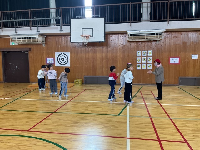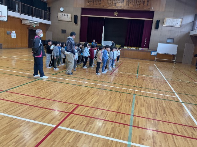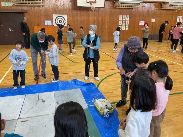 地域の方々にたくさん来ていただいて、1年生が世代間交流を行いました。こま回しや竹とんぼ、あやとり、お手玉、ぼうずめくり、けん玉、輪投げなど、昔の遊びを教えていただいて、2時間楽しみました。今はほとんど子ども達だけでは遊ぶことのなくなった遊びばかりですが、教えていただいて、みんな楽しそうに遊んでいました。
