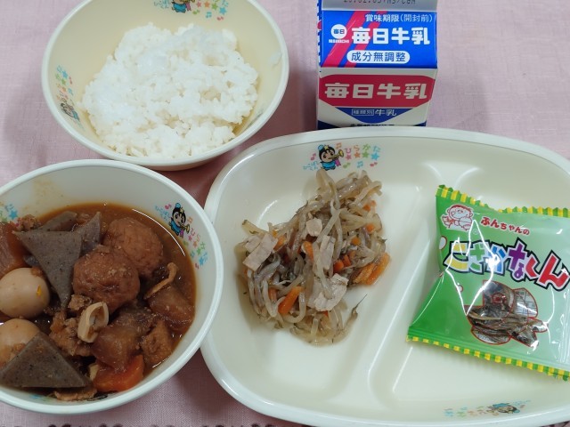 <今日のメニュー>みそおでん・もやしの炒め物・ミニフィッシュ・ご飯・牛乳