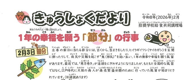 給食だより2月号 公開日 2026/02/02 更新日 2026/02/02 お知らせ・緊急連絡 給食だより2月号をアップしました。こちらよりご覧になれます。きゅうしょくだより2月(招提共調) いいね(0)
