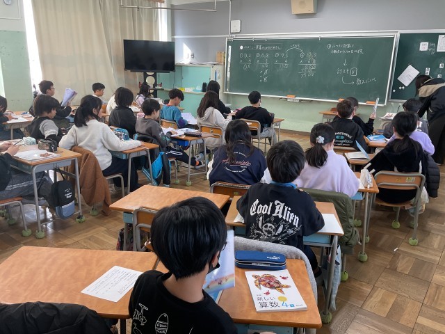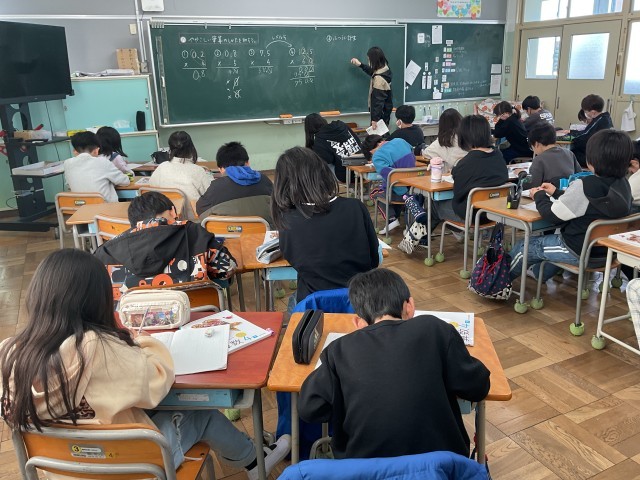 小数を含む筆算を4年生が学習しています。計算した後、間違いなく小数点を打つことをみんなで確認しています。
