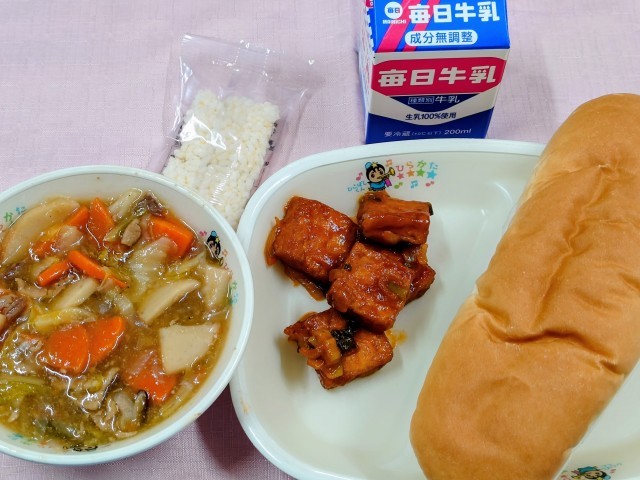 <今日のメニュー>うずら卵入り八宝菜・厚揚げのチリソース・おこげ・コッペパン・牛乳