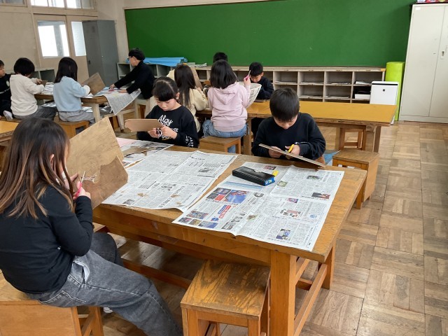 3年生が図工室で版画に取り組んでいます。まず板木に全体の絵をほって、黒インクで版画をした後、絵の中の動物を切り取って、スタンプのように押していきます。一つの版で二つの作品を作ります。