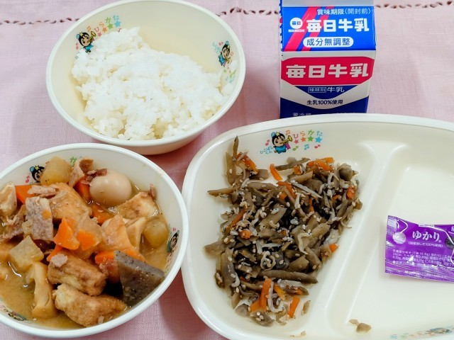 <今日のメニュー>みそおでん・じゃこ入りきんぴら・ゆかりふりかけ・ご飯・牛乳