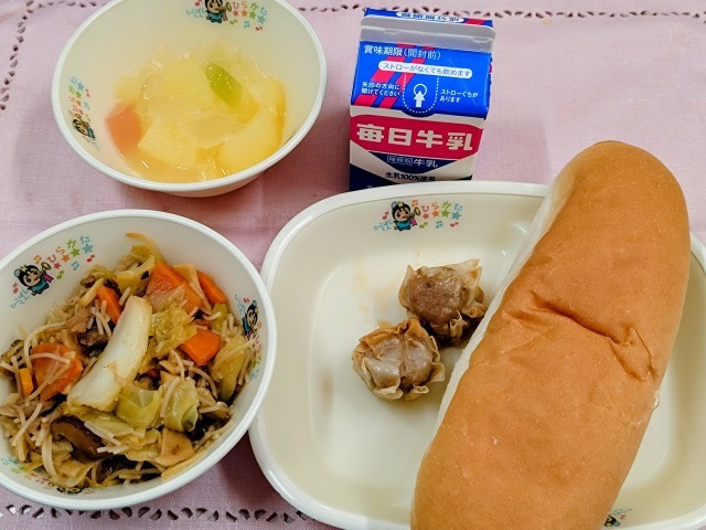 <今日のメニュー>野菜炒め・シュウマイ・フルーツポンチ・コッペパン・牛乳