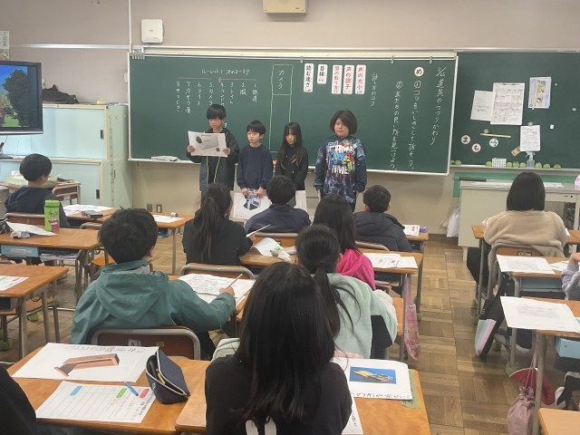 3年生の教室では、道具の移り変わりについて調べたことを、グループごとに発表しています。カメラや掃除機、冷蔵庫、ライトなど、どのように変わってきたのかを調べて、文章にまとめ、そして大きな声でわかりやすく発表できました。