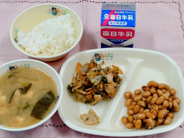 <今日のメニュー>みそ汁・菜の花のかき揚げ・ぶどう豆・ご飯・牛乳