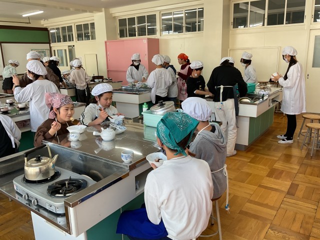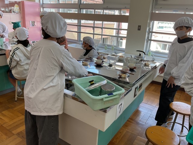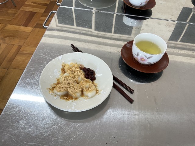 5年生の家庭科では調理実習で白玉団子を作りました。団子の粉をこねて沸騰したお湯でゆがくと白玉団子が出来上がります。あずきときなこを添えて、お茶と一緒に並べると素敵な和のスイーツの出来上がりです。