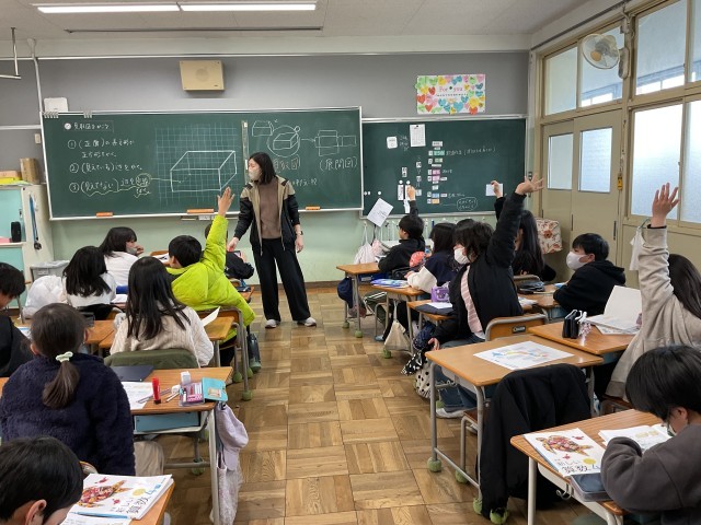 4年生の算数では、直方体や立方体といった立体図形を描き表す「見取り図」と開いた形の「展開図」を学習しています。それぞれの面や変がどこについているか、考えながら図を描いていきます。特に展開図は、書き上がった後、その通りに切り取って、組み立てると元の立体にならなければなりません。さて・・・