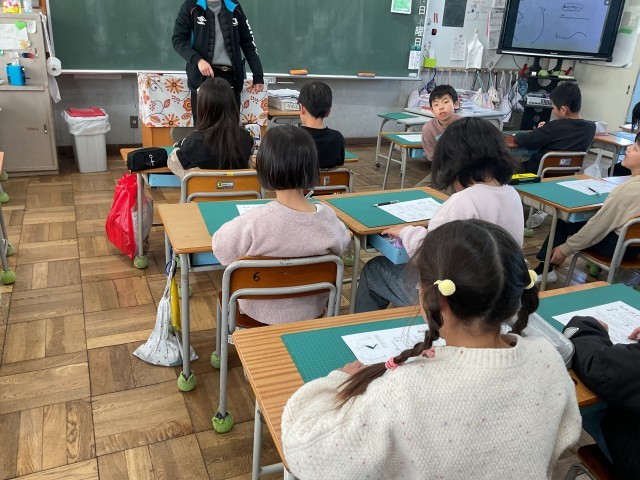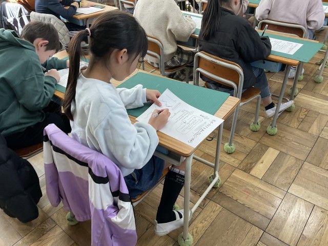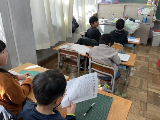 2年生の図工では、カッターナイフの使い方を学習しています。安全に使うためにはどうしたらいいのか、カッターを動かしたらいいのか、紙を動かしたらいいのか、色々試しています。