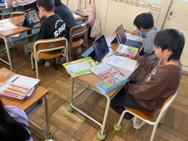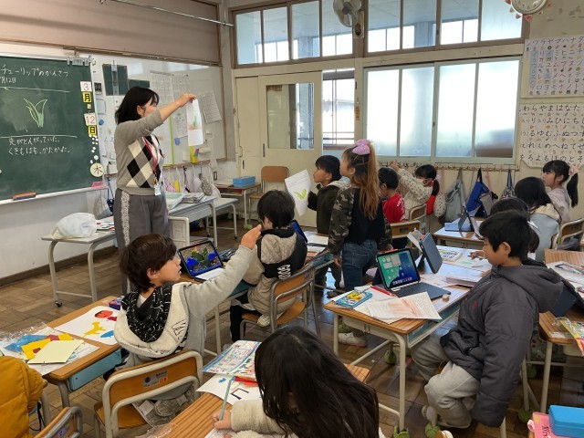 1年生が自分の植木鉢の植えているチューリップ。暖かい日もありずいぶん大きくなってきました。今日はそのチューリップを自分のタブレットで撮影して、観察して描いています。みんな上手にかけていますね。