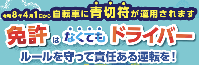 免許はなくてもドライバー ルールを守って責任ある運転を! 公開日 2026/03/17 更新日 2026/03/17 枚方市教育委員会より 令和8年4月1日より「自転車」に【青切符】が適用されます。ご家庭におかれましても、お子さんにお話しいただければ幸いです。⇨ 免許はなくてもドライバー いいね(0)