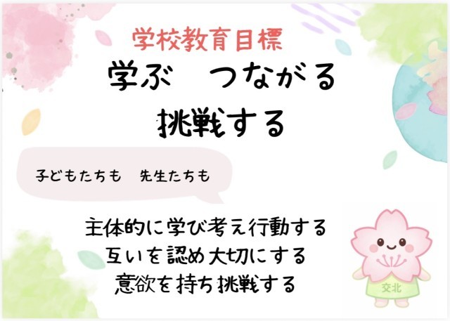 始業式では、入学式で1年生に伝えた「交北小の合言葉」(学ぶ つながる 挑戦する)を紹介しました。