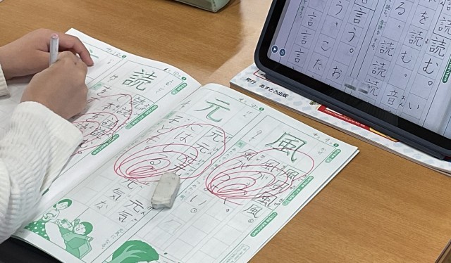 2年生の教室に行くと、新しい漢字を学んでいました。手元のタブレットで先生のお手本を確認しながら、しっかり丁寧に書いていました。