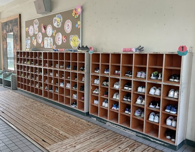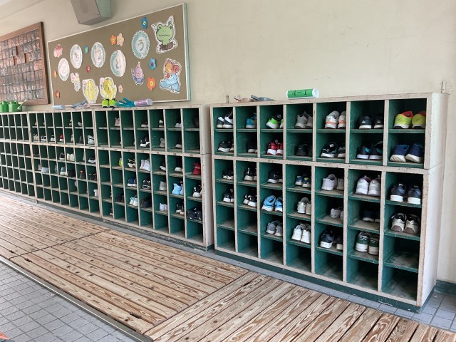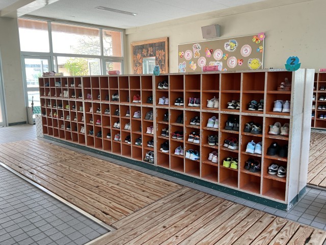 交北小学校の玄関には、376人分の靴があります。