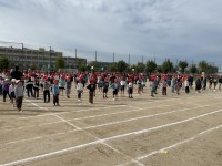 新しいクラスで、先生と一緒に給食を取りに行きます。