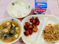 <今日のメニュいー>わかめスープ・ヤンニョムチキン・もやしのナムル・ご飯・牛乳今日は韓国メニューです。ヤンニョムチキンは鶏肉の唐揚げに薬念(ヤンニョム)という甘辛いタレを絡めたもの。今日はピリ辛のタレ...