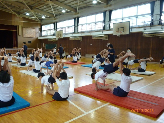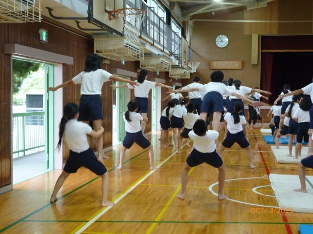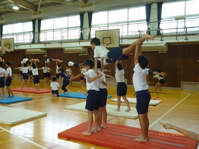 運動会では、5年生と6年生合同で組み立て体操を行います。一人技からていねいに練習を重ね、かなり上手になってきました。