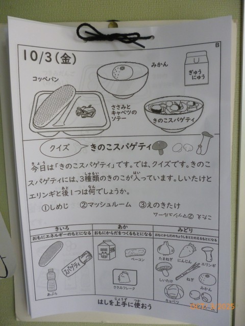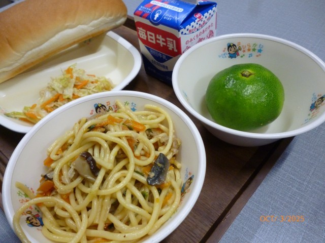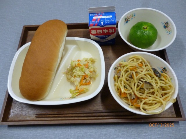 今日の給食は、「コッペパン・きのこスパゲティ・ささみとキャベツのソテー・みかん・牛乳」です。