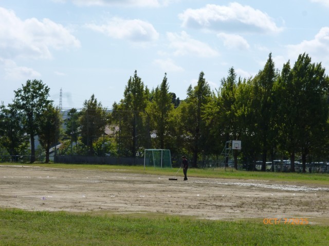 昨日の放課後、運動会に向けて、にがりをまいたので、それがうまく土と混じり合うように、教頭先生がならしていたのでした。(砂ぼこりの発生を防ぎ、土壌を安定させる目的でにがりをまきます。)