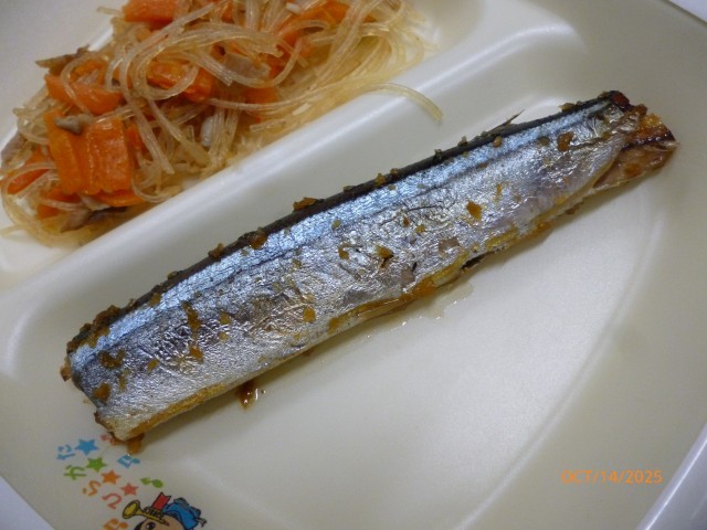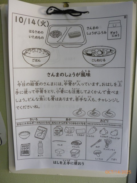 秋の味覚、さんまです!骨付きのまま出されるので、「骨あるのイヤや〜。」という声も聞こえてきましたが、給食のさんまは、骨がとても取りやすい状態なので、心配ご無用です! みんな、上手に骨を取ることができたのではないでしょうか。