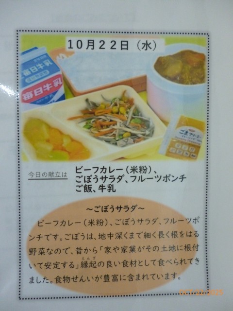 6年生が中学校給食の試食をしました。今日の献立は、「米粉のビーフカレー・ごぼうサラダ・フルーツポンチ・ご飯・牛乳」でした。