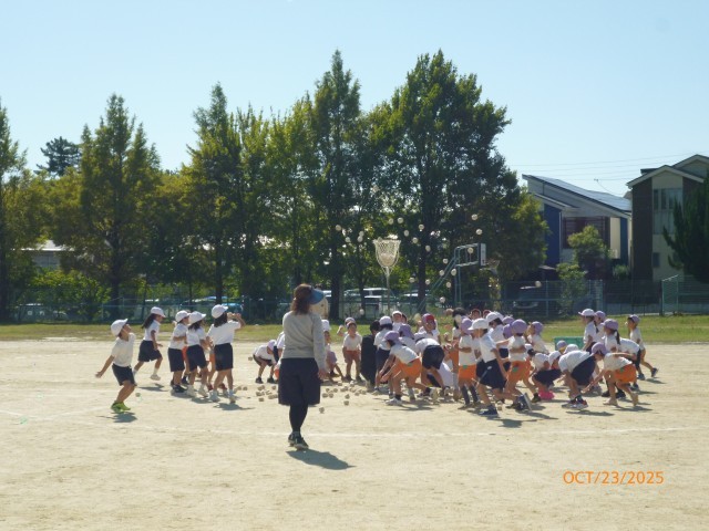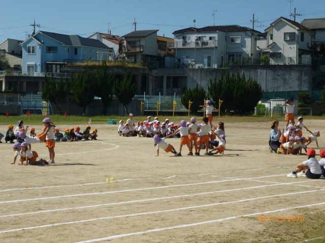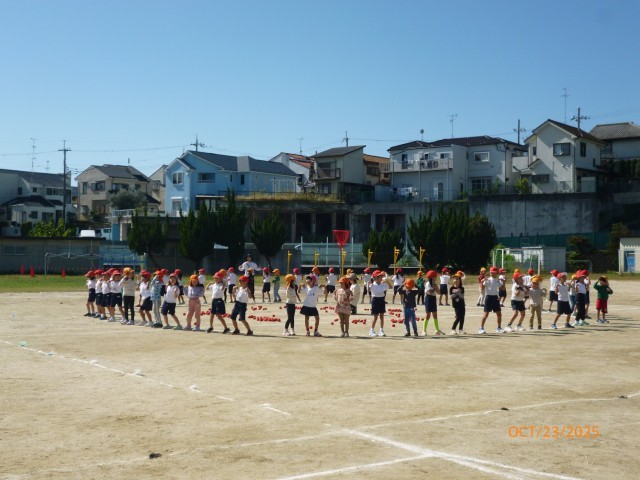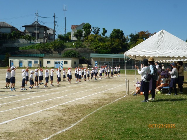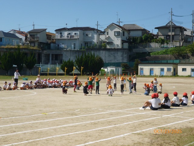 今日は、香陽小学校の運動場で、お互いの運動会での団体演技を見合いっこしました。1年生の子どもたちは、自分たちよりひとつ年下の保育所の小さいお友だちの踊ったり、体操をする姿に自然と拍手をおくっていました。