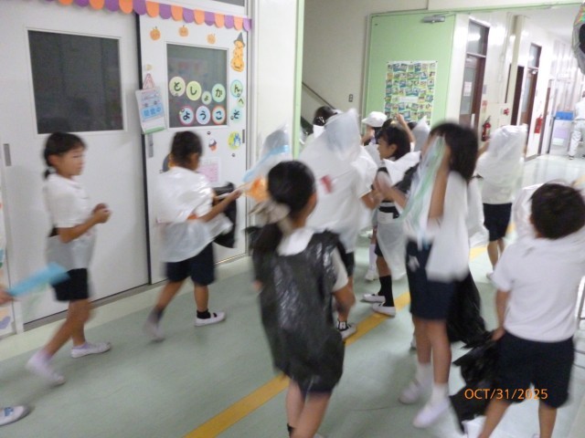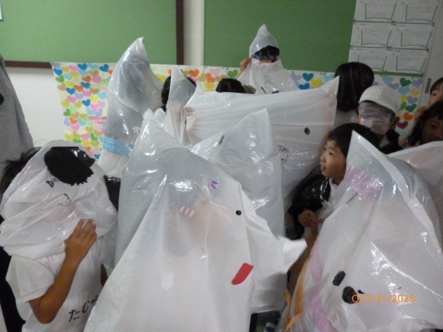 1年生の子どもたちが、ビニール袋などでおばけになりきって、「Trick or Treat」  いたずらされると困るので、お菓子ではなく、かわいいハロウィンシールをプレゼントしました。