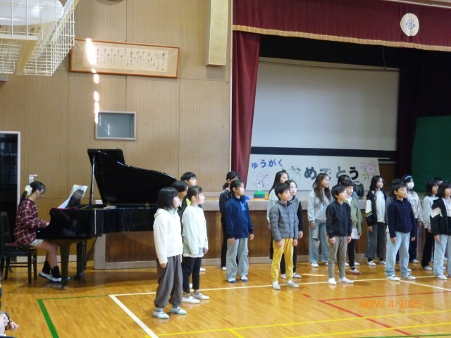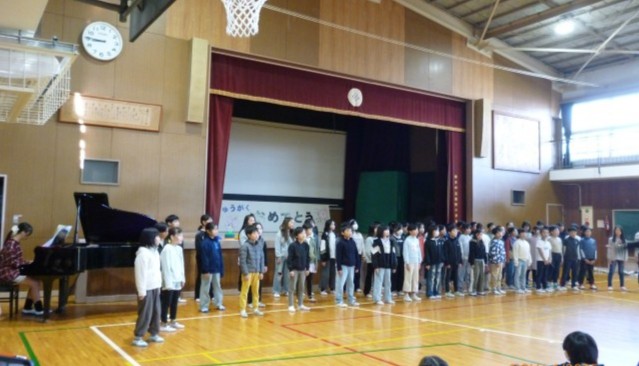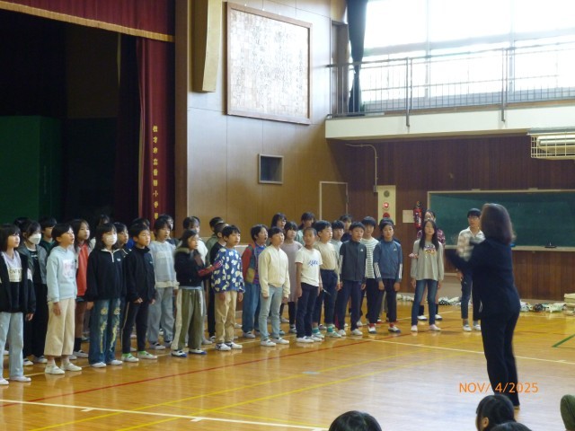 今日の児童集会では、11月18日(火)に枚方市小学校合同音楽会に出場する4年生の合唱披露がありました。
