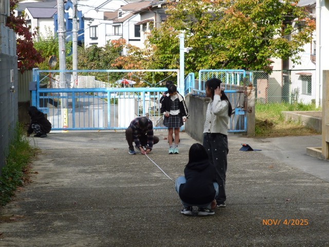 中庭で5年生の児童がまきじゃくを持って、何かをしていました。