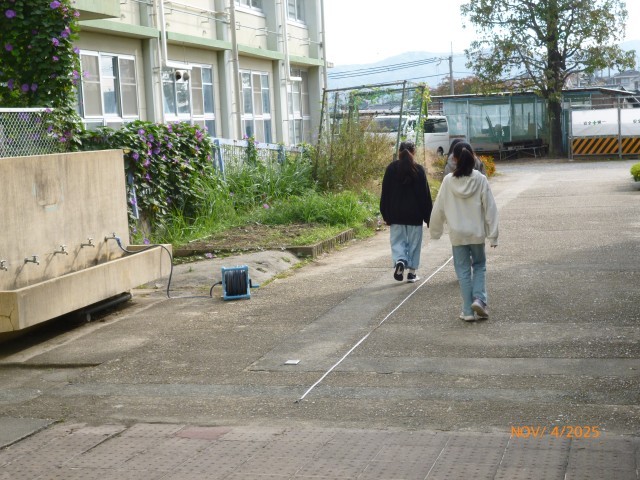 「何をはかっているの?」と聞くと、「10歩分の距離の平均を求めるねん。」とのこと。今、算数では平均の求め方の学習をしているそうで、10歩分の距離のクラス平均を出そうとしていたのです。