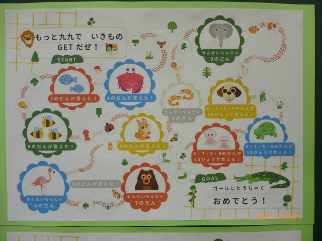 プリントを使う? 九九の歌で復習する? 九九の表で読み上げる? などなど・・・。そして、その成果や積み重ねがわかるように「九九でいきものGET!」で進み具合を確認していきます。