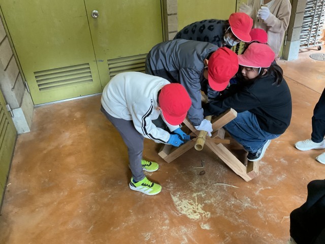 竹切り体験ではどの子も集中し、竹がずれないように仲間が支えてくれました。
