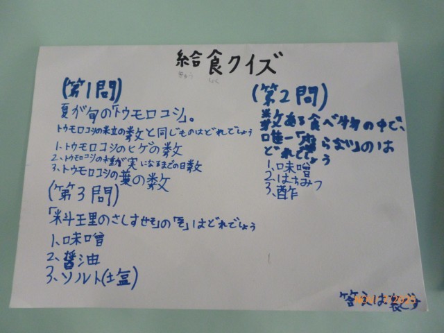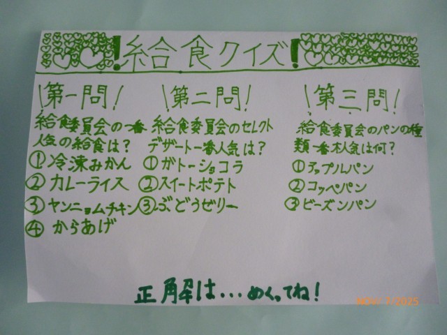「給食委員会の一番人気の給食は?」「給食委員会のセレクトデザート、一番人気は?」のクイズに、「そんなん、知らんやん!」と、思わず心の中でつっこんでしまいました。給食委員会の一番人気と香陽小の全校児童の一番人気は同じなのでしょうか?! とても気になる校長です。(笑)