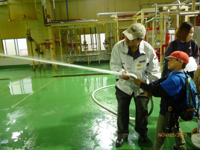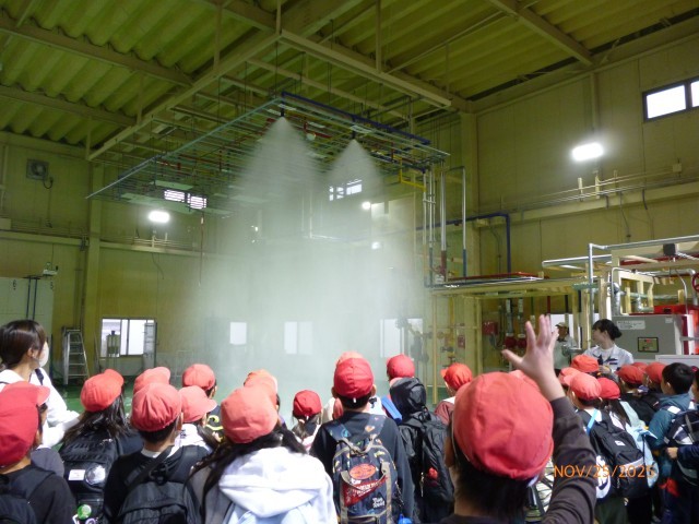 初田製作所さんは、消化器や消防設備、自動消化システムなどをつくられている会社です。消化器がどのわうにつくられるのかや消化器の歴史を教えていただいたり、スプリンクラーから水が出る様子(この水の威力には、みんな、びっくり!)を見たり、消火栓から水を出す体験もさせていただきました。