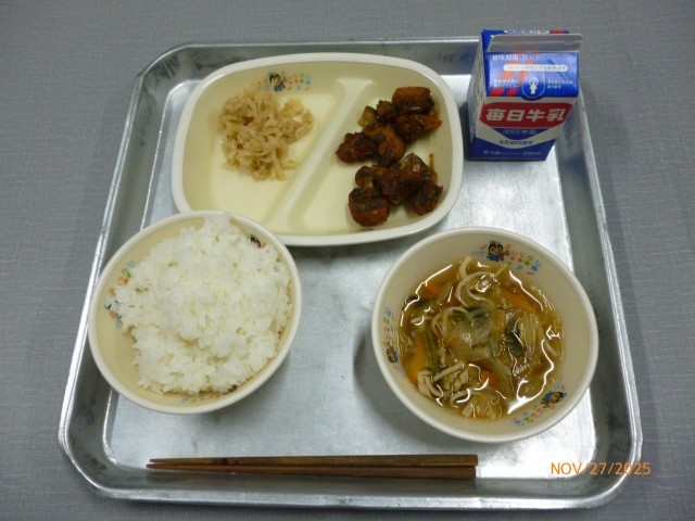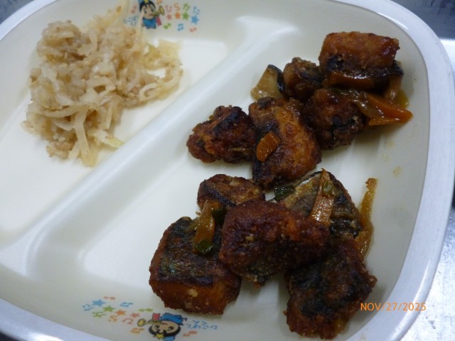 今日の給食の献立は、「ご飯・玉ねぎのおつゆ・ウマウマ!さばのカレーあんぶっかけ・いためたくあん・牛乳」でした。